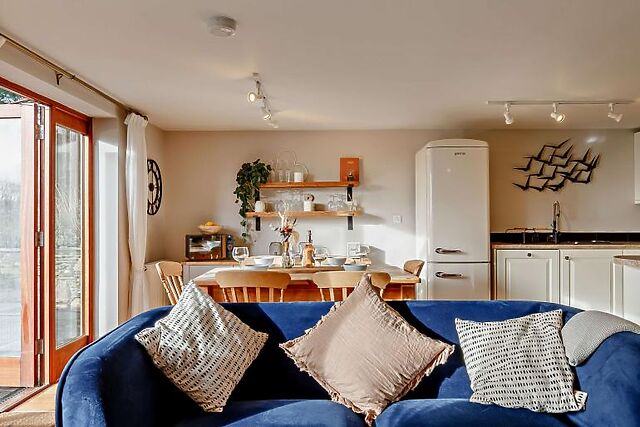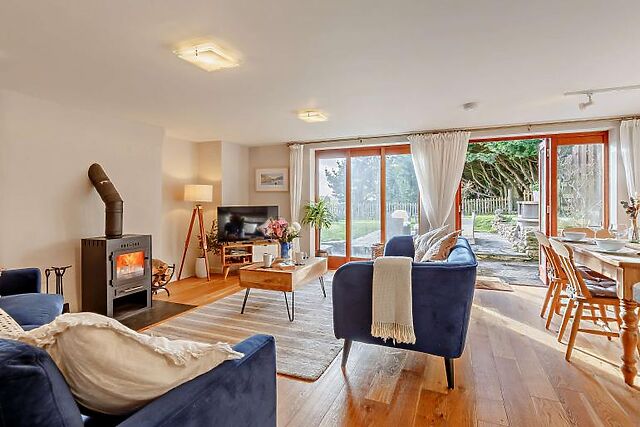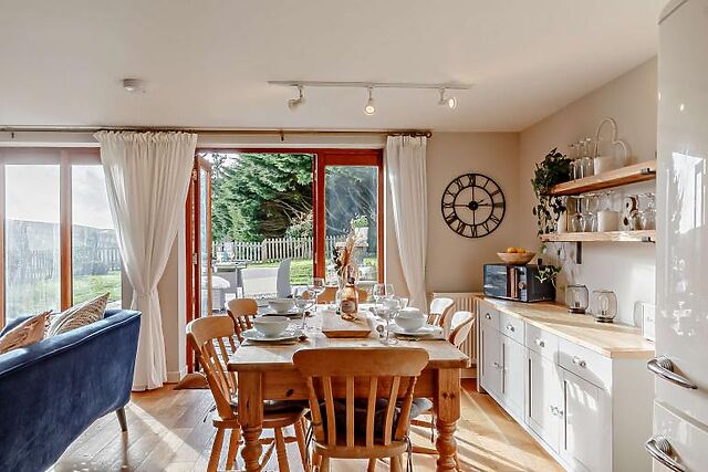 The open-plan living area features floor-to-ceiling windows, allowing natural light to flood in and offering breathtaking views of the surrounding countryside. A cosy wood burner adds to the charm, making it a perfect retreat no matter the weather.