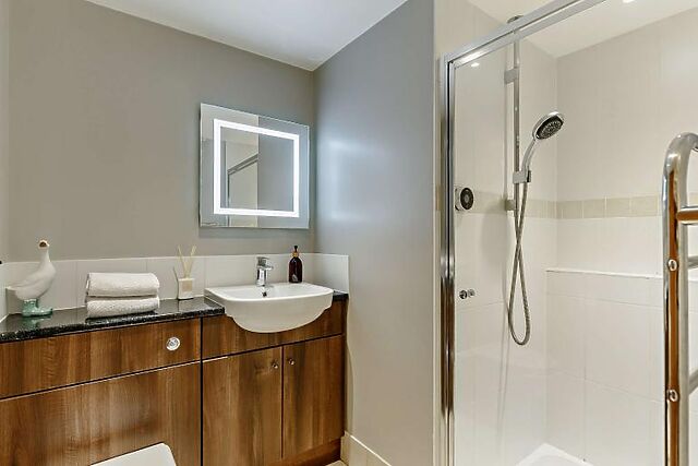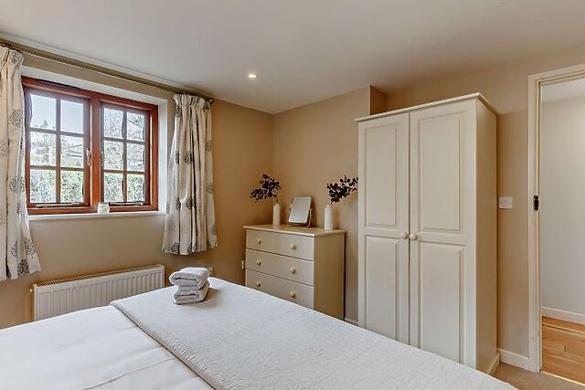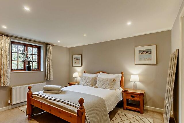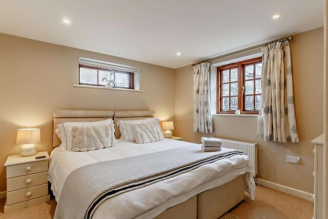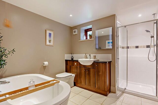 The master bedroom upstairs offers a super-king-size bed and an en-suite shower room, ensuring a restful night's sleep. The two additional bedrooms, one king-size with an en-suite and one twin (which can be made into a super-king), provide ample space and comfort.