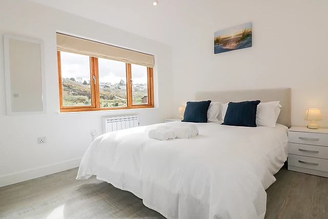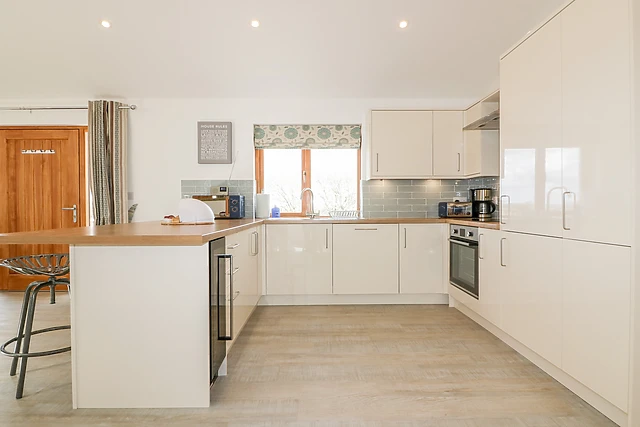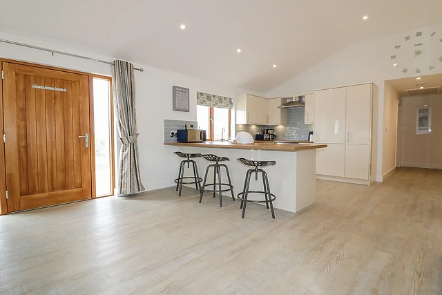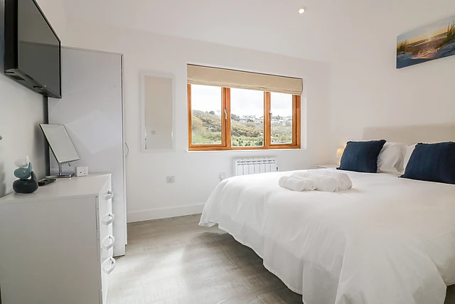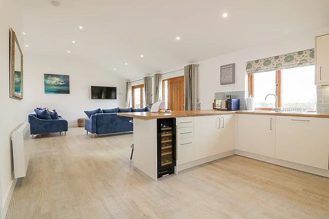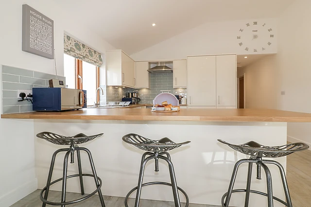 Illuminated with natural light, the contemporary open-plan living space offers a delightful space to relax in the evening; take a seat on the sumptuous sofa before the Smart TV, tuning into your favourite on-demand shows or simply reminiscing over the holiday so far. Head to the breakfast bar and keep the chef of the group company whilst they get acquainted with all the mod cons, including an electric oven and hob, microwave, fridge/freezer and a dishwasher, so you won’t have to lift a finger when it comes to washing up!