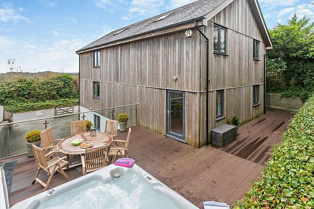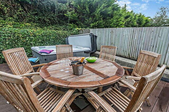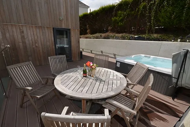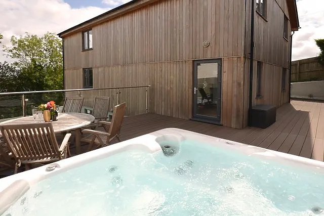 Yes, the accommodation boasts a luxurious hot tub located on the enclosed decked balcony, offering guests a relaxing experience with picturesque views.