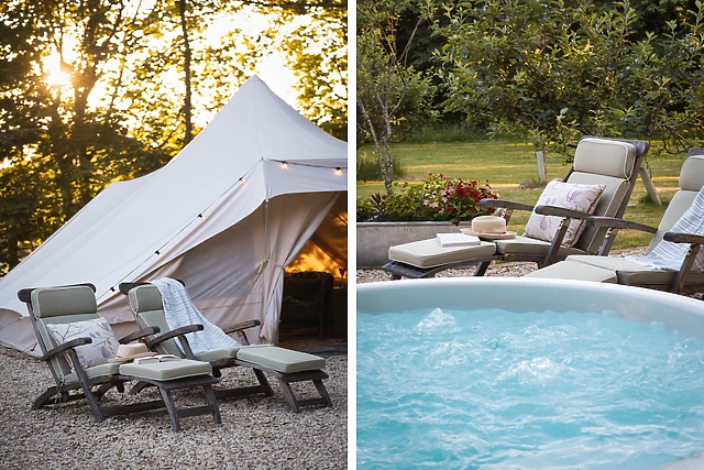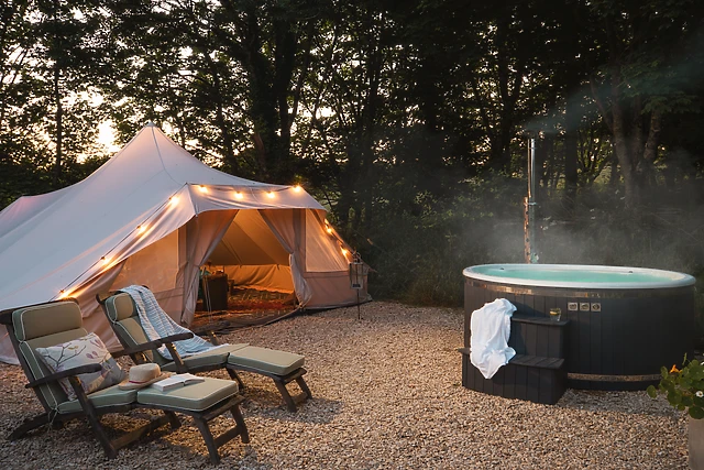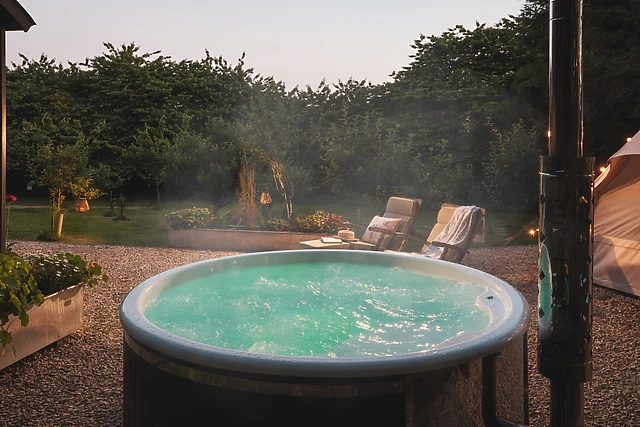 Enjoy a romantic dinner for two at the dining table, with the warm glow of the woodburning stove setting the perfect mood. As night falls, retreat to the snug Bedouin tent, where you and your loved one can cosy up and plan the day's ahead.