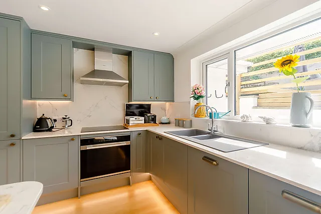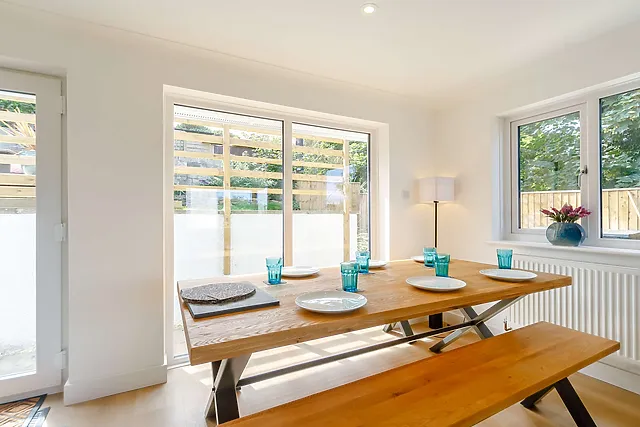 Outside, the enclosed garden features a terrace and BBQ, perfect for al fresco dining.