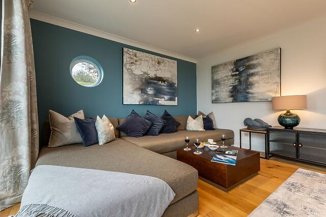 The cottage features a contemporary kitchen, a cosy snug, and a spacious lounge with coastal hues. The dining room on the first floor boasts wonderful views across the rooftops out to sea.