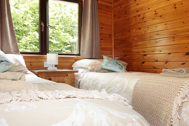 Follow the sense of charm round to the bedrooms, two twins are neatly styled, centred by a bedside table with low lighting to give the room a soothing glow. For something different, the double bedroom is a relaxing place to settle down, accessorised with lovely cushions, and storage space which charmingly rests above the bed.