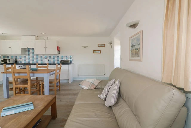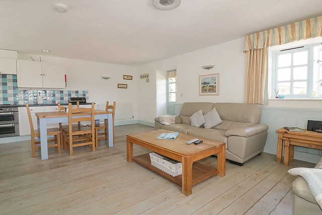 The cottage welcomes you with a bright and inviting open-plan living space, complete with a well-equipped kitchen, dining area, and cosy sitting area—ideal for unwinding after a day of exploration.