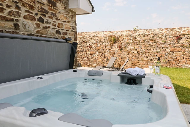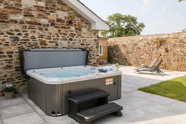 A fully-equipped kitchen invites you and your loved one to prepare a delicious, home-cooked dinner, whilst a dining table for two or a plush sofa make for ideal spots to savour your culinary creations. To relax, pop a film on the sleek, wall-mounted Smart TV as you're kept warm by a tasteful electric fireplace, or head out back into the enclosed garden, where you'll find a well-manicured lawn scented by potted lavender, a patio with sun loungers, and your very own hot tub, where you can unwind as you watch day roll into night.