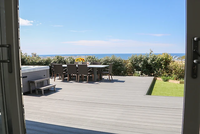 The heart of this home is the open-plan living space, where you can gather for meals or unwind with a glass of wine. Step outside to the multi-level terrace and indulge in the luxury of a hot tub, or simply admire the sunset from the upper balcony.