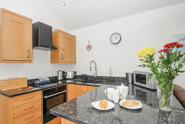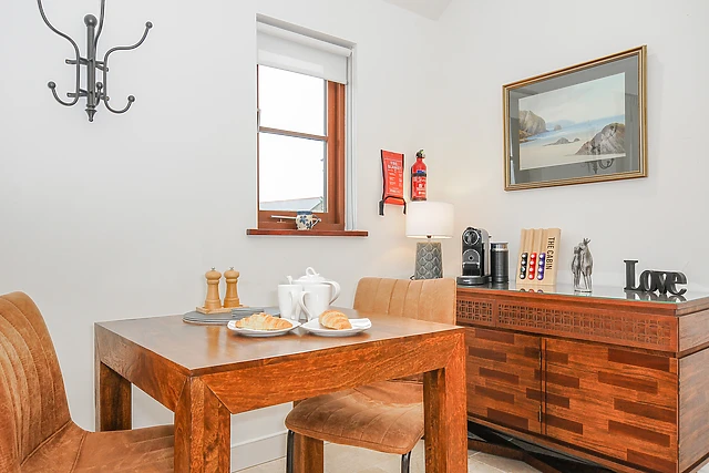 Park up and head towards your new abode, enjoying the vantage point of Pol Glas Cabin, before entering the open-plan living space, where you can relax in front of the Smart TV, prepare meals in the well-equipped kitchen, and dine around the table for two; the space is flooded with light, whilst featuring a lofty vaulted ceiling with original beams. Spend the evening in the enclosed garden, where you can prepare a barbecue, unwind upon the outdoor furniture, or take a dip in the hot tub with fields as your neighbour.