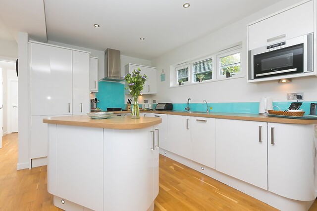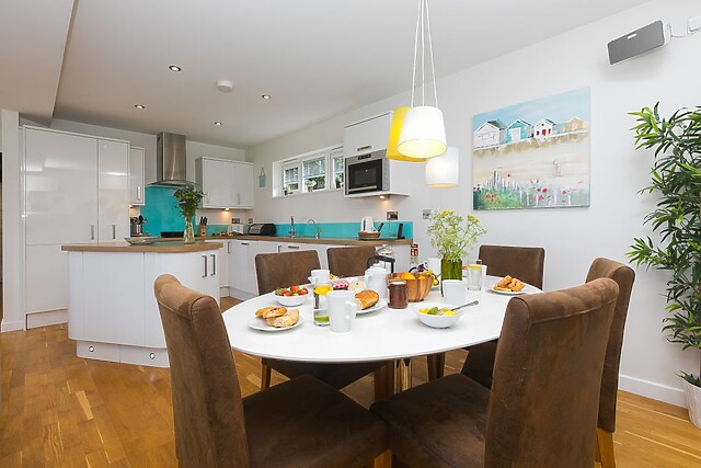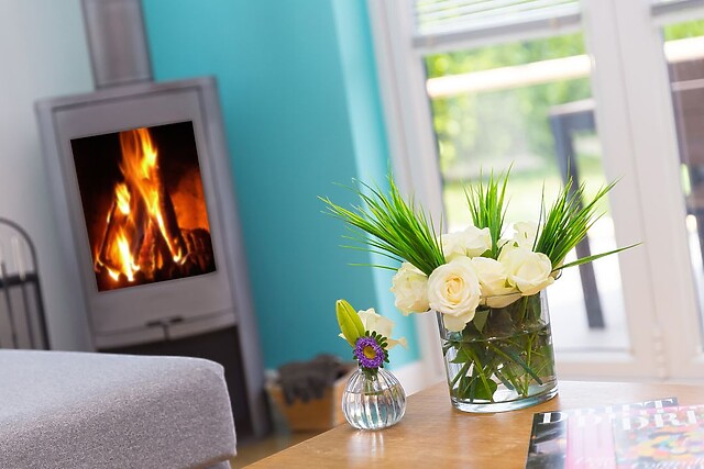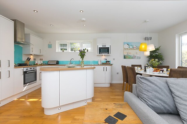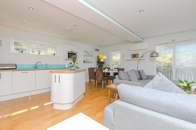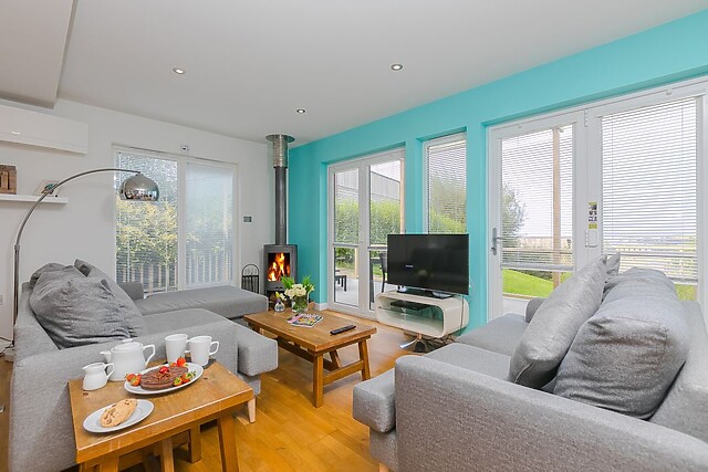 During cooler months, the warmth of the woodburning stove adds a comforting touch. Step through the patio doors onto the decking, where sweeping sea views and an abundance of natural light create a serene atmosphere.