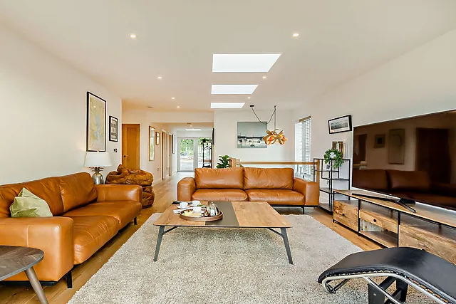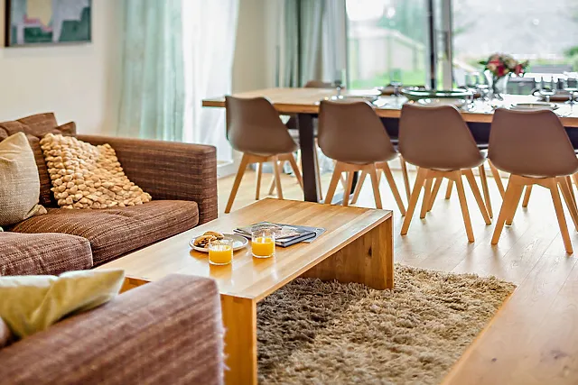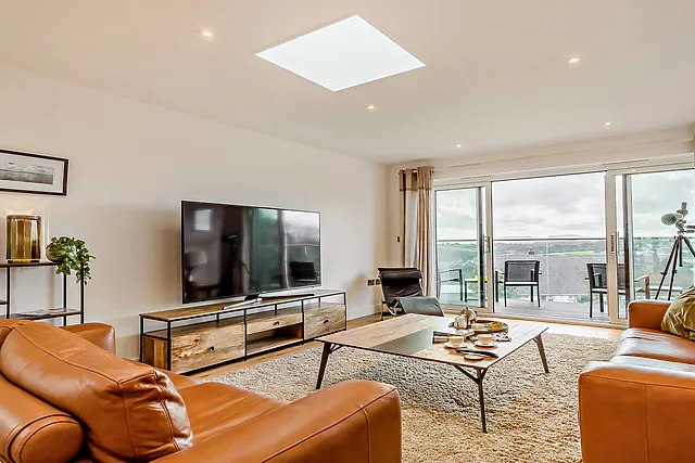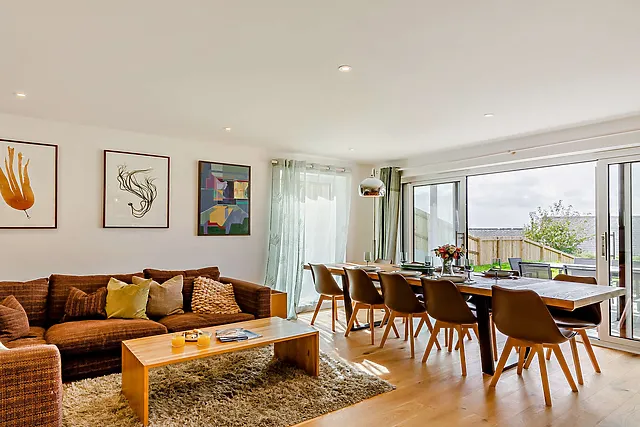 This is a great spot to watch the sunset after a long day exploring the area. A beautiful staircase leads down to a huge family space with an open plan lounge/kitchen diner with a feature dining table to seat all the party.