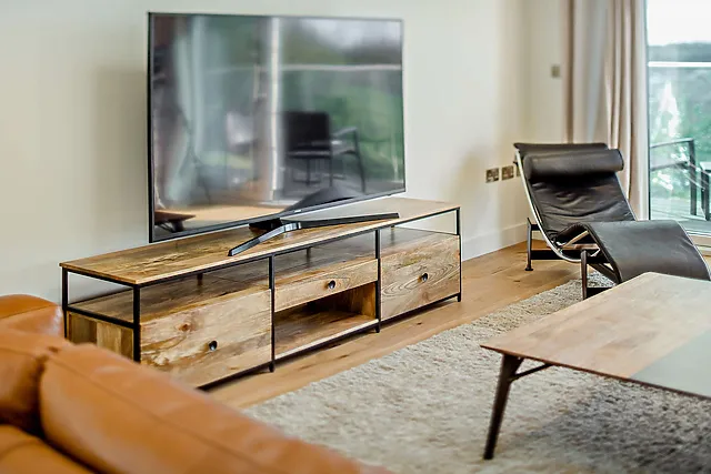 A separate family bathroom with a bath and walk-in shower can be found on this floor. The generous hallway opens into a beautiful open-planting room with an 80” flat-screen TV, comfy leather sofas, bean bags and large patio doors leading to the balcony.