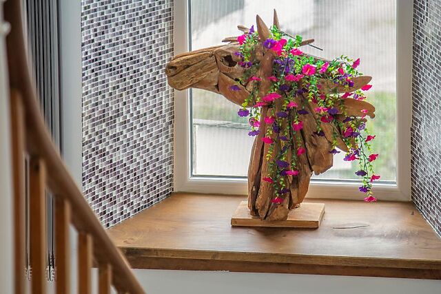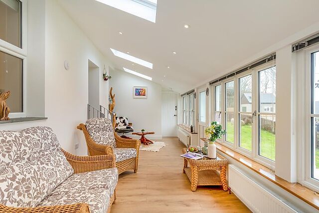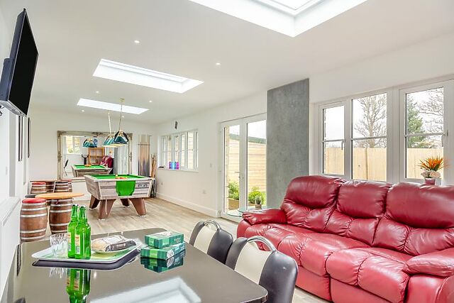 Straight ahead is the sun room with delightful views across the garden and seating to enjoy them, the ideal spot for a quiet read or relaxing. The hallway leads to a cosy lounge with ample seating and a Smart TV, while the other direction leads to a games room with a pool table, a karaoke machine and another Smart TV.