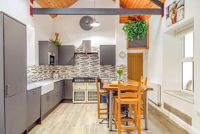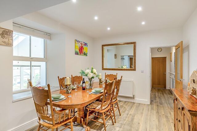 Enter through the front door of this three-storey cottage and into the kitchen/diner. Charming vaulted ceilings, a breakfast bar and a dining table present a warm welcome to any budding chef, and with a Rangemaster oven and a coffee machine, you’ll have everything you could possibly need for group catering.
