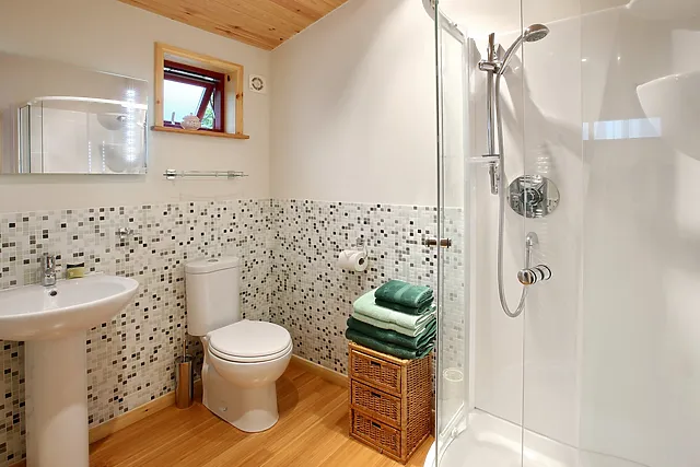 The cottage boasts a glass-covered decked area with a hot tub, a lawned garden, an outdoor heated shower, and a charcoal BBQ for guests to enjoy.