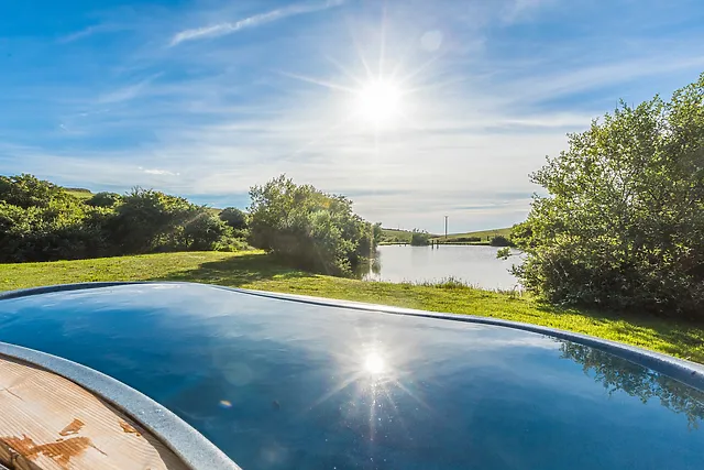 Yes, it features a private wood-fired hot tub, perfect for relaxing and enjoying the beautiful views of the lake and countryside.