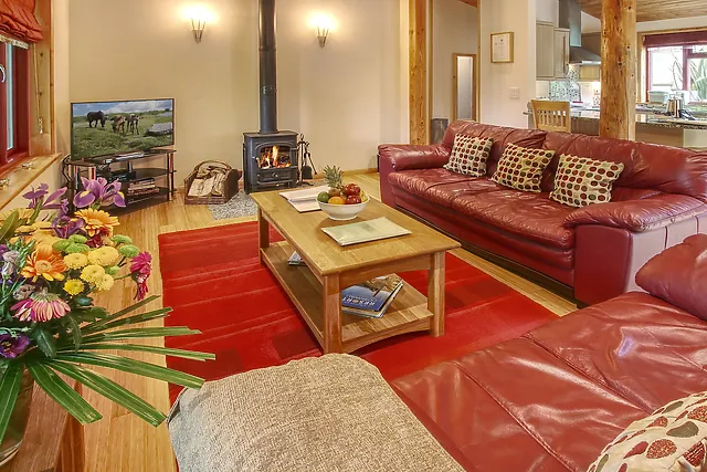 The open-plan living space, complete with a wood burner, offers a cosy setting for family or friends to gather.
