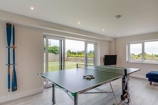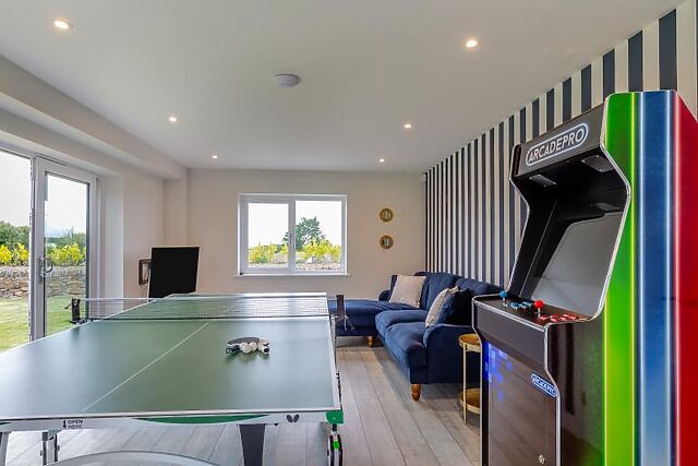 As you step inside, you'll be greeted by a grand hallway leading to four bedrooms and a family bathroom. The highlight of the ground floor is the games room, featuring a retro arcade game, large Smart TV, and table tennis.
