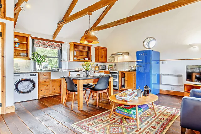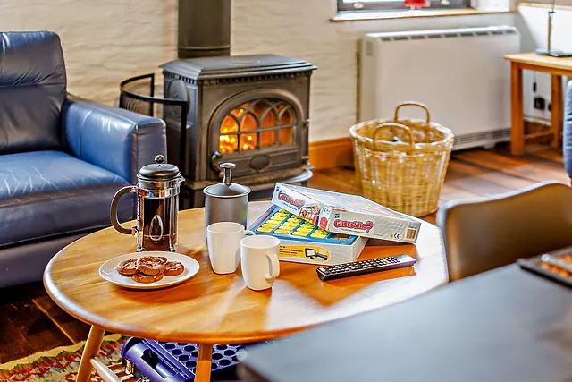 The inviting open-plan living space, complete with a wood burner, is perfect for unwinding after a day of exploration.