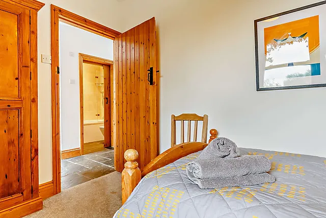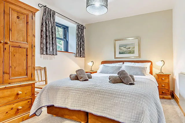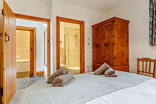 The accommodation boasts two cosy bedrooms, one with a king-size bed and an en-suite, and another with handcrafted full-size wooden bunk beds.