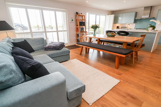 The open-plan living space, with its modern kitchen and cosy sitting area, is the heart of the home, where memories are waiting to be made.