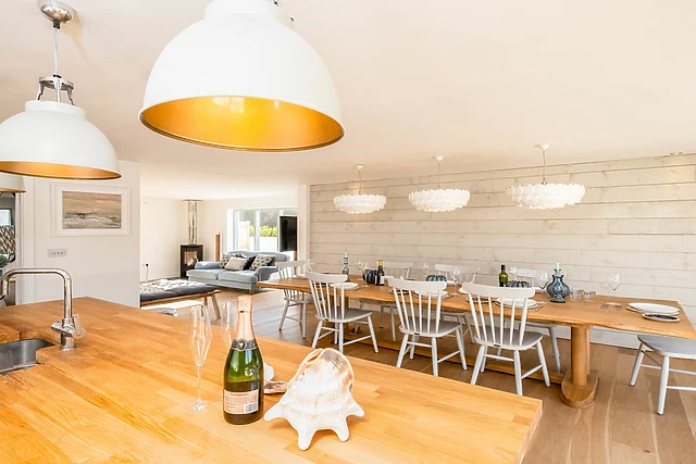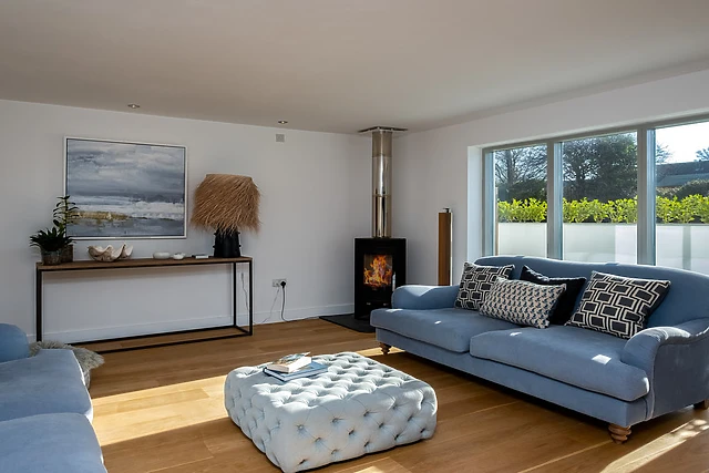 Seastar's contemporary open-plan living space, complete with a woodburning stove, offers the perfect backdrop for relaxation and socialising.