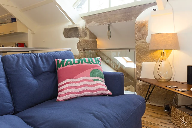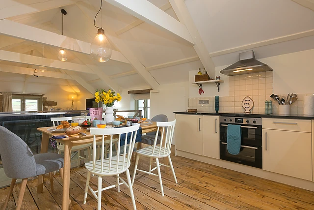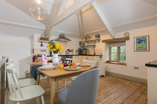Venture up to the first floor to discover the heart of the home, an open-plan, airy vaulted area combining a kitchen, dining room, and sitting room. The kitchen is well-equipped for all your culinary needs, while the dining room provides a sociable space to enjoy meals together.