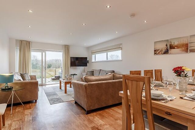The lounge features three large comfy sofas and doors that open onto a decking area, perfect for relaxing or enjoying a meal together. The first floor hosts two super-king-size zip-and-link bedrooms, both with en-suite shower rooms and TVs.