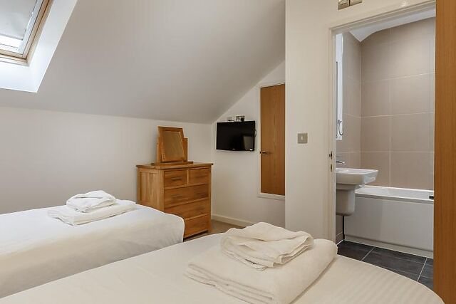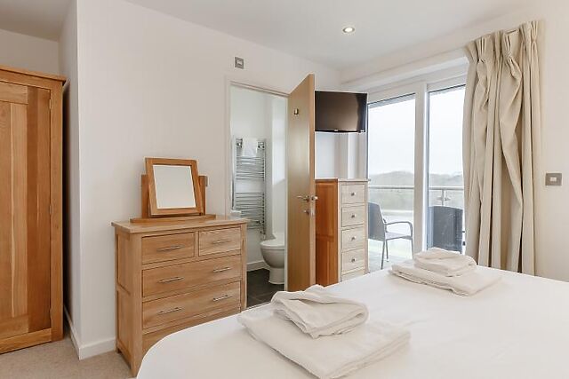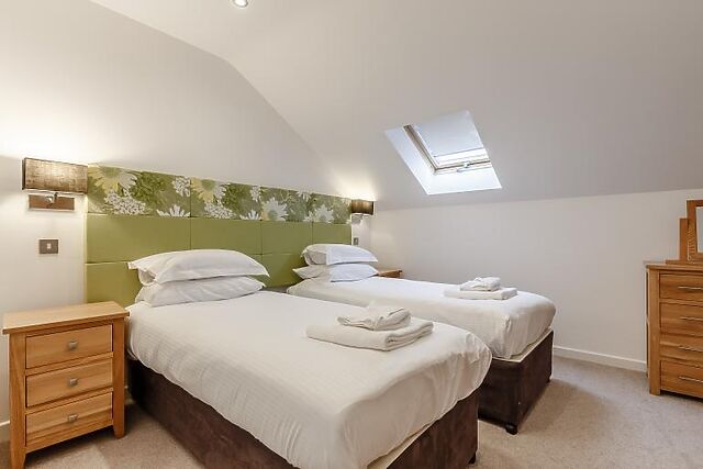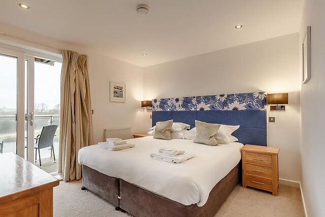 On the second floor, you'll find two more super-king-size zip-and-link bedrooms, each with en-suite facilities. One of these bedrooms also has access to a private balcony with outdoor seating and views over the lake.