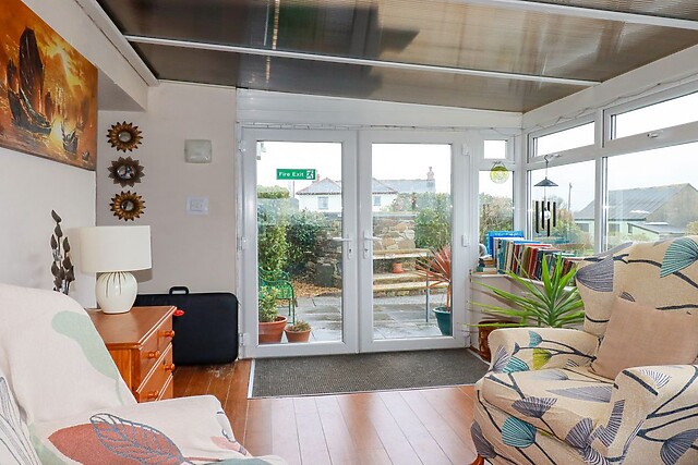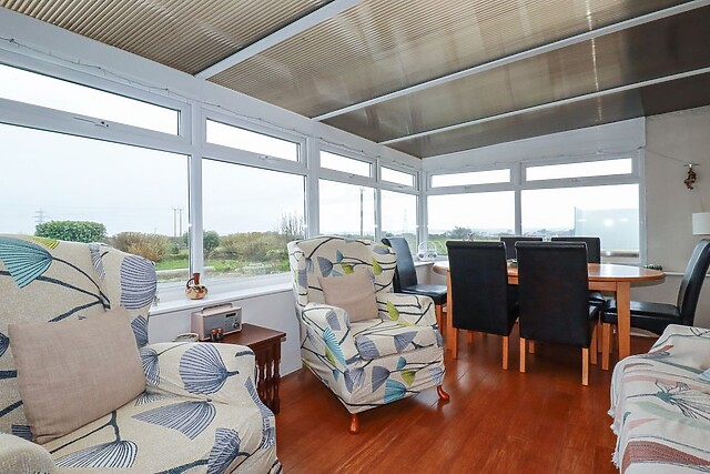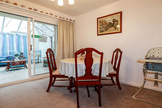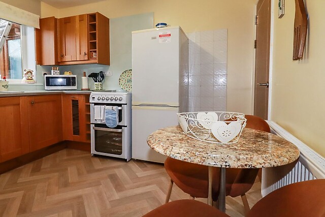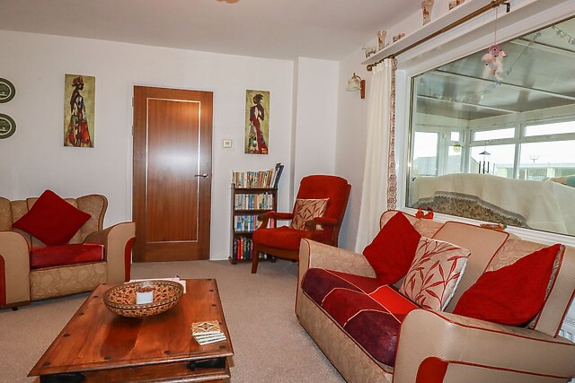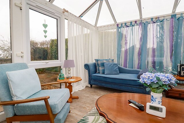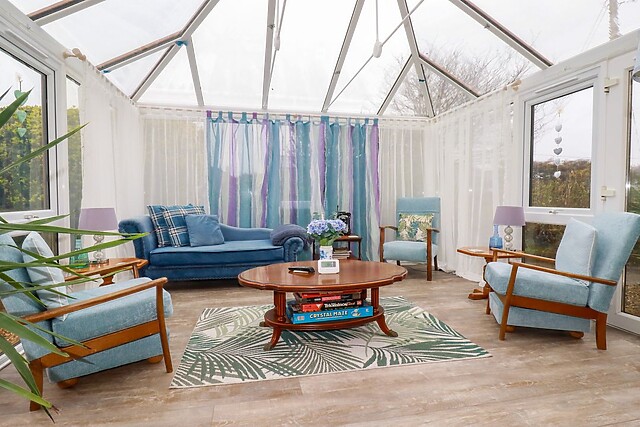 Here, you will find everything you need to whip up delicious hearty meals, with a utility room housing a tumble dryer for your convenience. Continue through to the conservatory/dining room, where a dining table for six guests awaits for you to enjoy your meals, surrounded by a selection of books for your entertainment.
