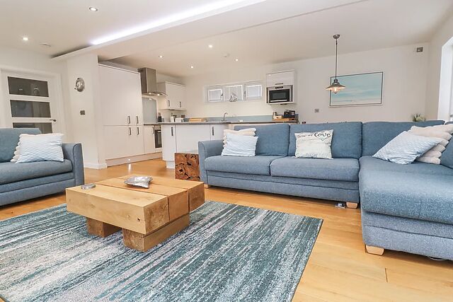 Walk up a few steps to enter the contemporary open-plan living area. Choose from the corner or normal sofa to sit back and indulge in the holiday vibe.