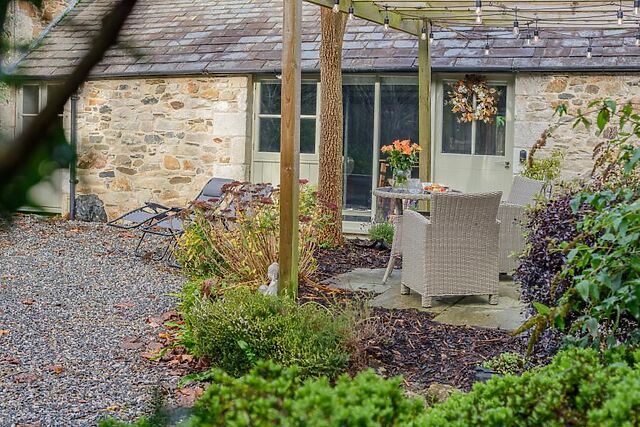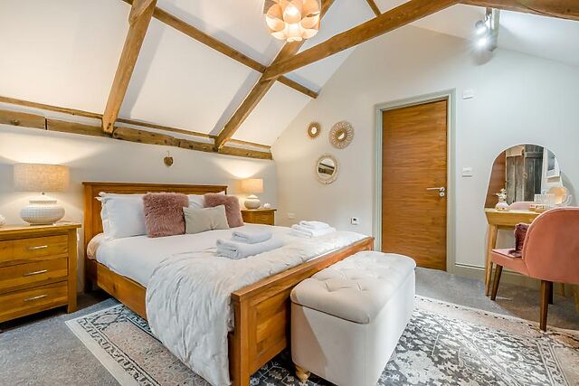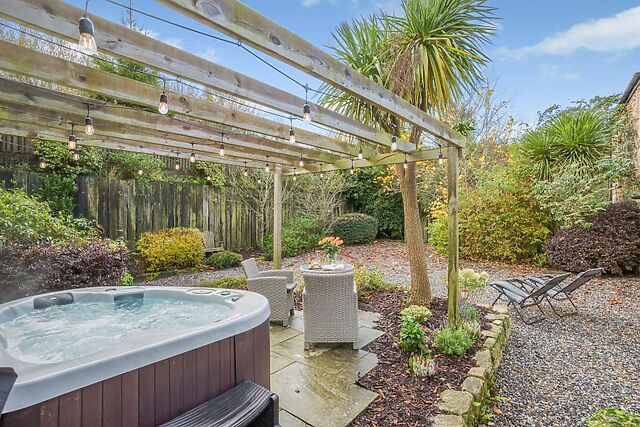 A few steps up from the open-plan living space leads to the spacious king-size bedroom, which boasts shutters and original high ceiling beams, offering a haven to ensure a restful night’s sleep before starting your next day with a soak in the en-suite bathroom, which features a free-standing roll-top bath. Soak up your tranquil surrounding scenery from the comfort of the bubbling hot tub set on the patio, or sit back and relax on the bistro set in the large, landscaped courtyard – the perfect spot for dining alfresco.