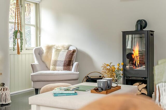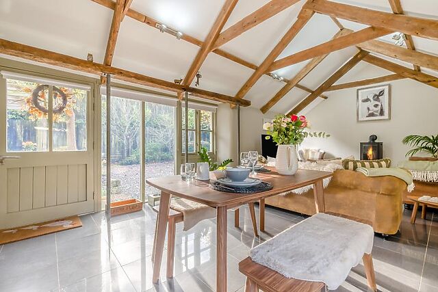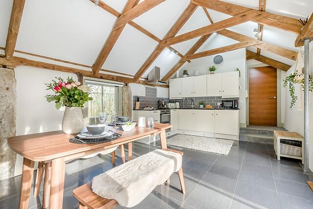 Combining stylish decor with a nod to the original calf house, the open-plan lounge/kitchen/diner that welcomes you into the heart of this barn conversion is bursting with rustic charm, boasting characterful features including beaten wood shutters, exposed beams and exposed granite plinths. This lovingly furnished, inviting space full of natural light enjoys a high ceiling that creates a welcome sense of space, as well as a wood burner-effect electric fire that sets the scene for pure relaxation.