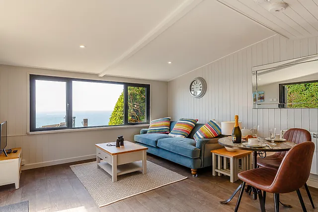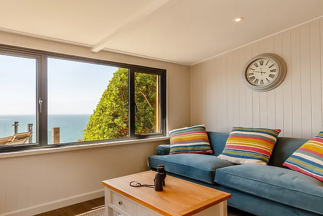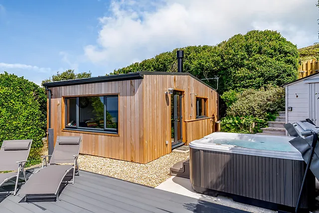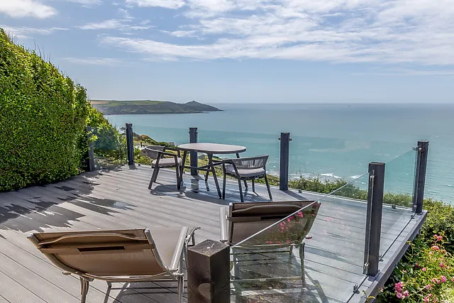 The highlight is undoubtedly the fabulous outside area, complete with a glass-fronted decked terrace and a sumptuous hot tub, where you can unwind and soak in the panoramic sea vistas.