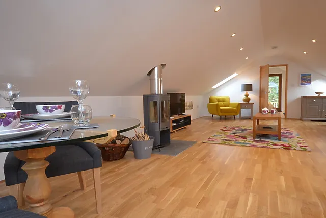 Indulge in the warmth of the wood burner in the spacious lounge, where contemporary styling meets comfort.