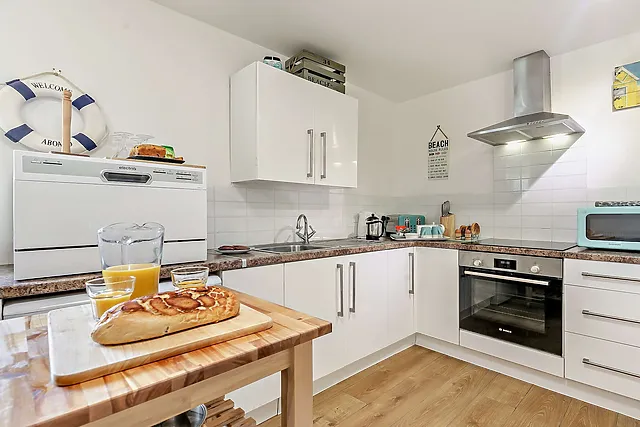 The kitchen is fully equipped with an electric oven and hob, microwave, fridge/freezer, counter-top dishwasher, and washing machine, catering to all your culinary needs.