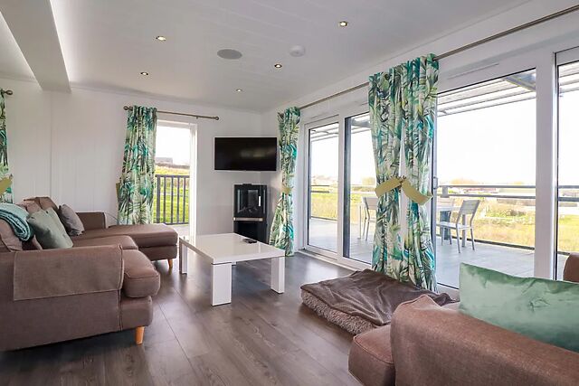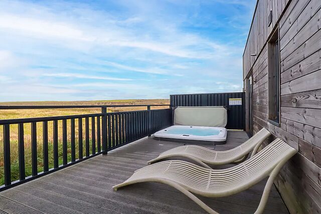 The sleeping quarters include two twin bedrooms and a master with en-suite shower, basin, and WC, complemented by a family bathroom with bath, shower over, basin, WC, and an inset TV for added luxury. Outside, a large decked terrace boasts loungers, seating, and a bubbling hot tub, all overlooking a grassed area leading to the dunes—perfect for dogs and children.
