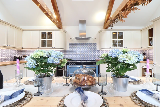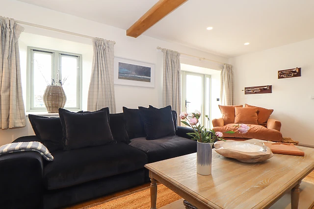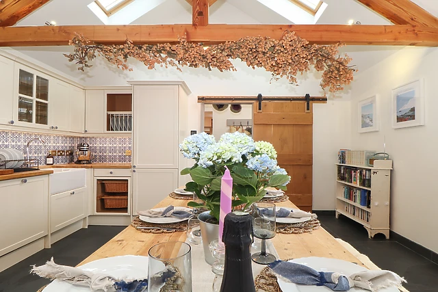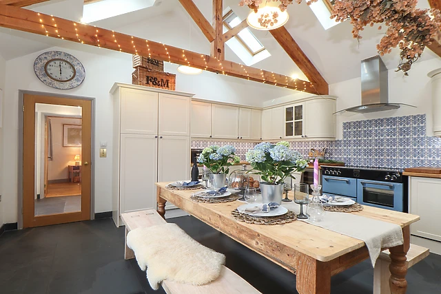 Step indoors and turn left to be welcomed by the fully-equipped kitchen/diner, housing a selection of appliances to ease your stay, with original beams overhead and a lovely bench-style dining table to gather around; a utility and cloakroom reside nearby for convenience. On cool evenings, retire to the sitting room featuring a rustling woodburning stove, sumptuous sofas to sink into, and a wide selection of books to delve into with a glass of wine in hand; film fanatics will love the chance to spend the evening in the private cinema room, offering a wonderful ambience as you watch your favourite movie.