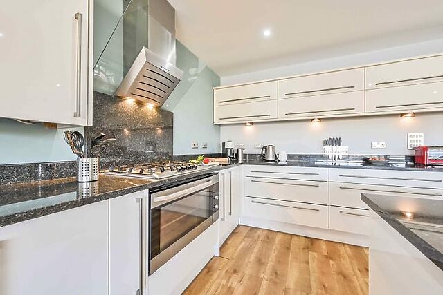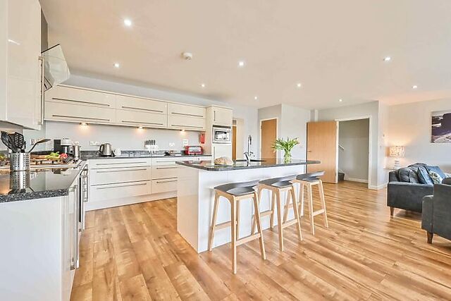 As you step inside, you'll be greeted by a breath-taking open-plan lounge, kitchen, and dining area. The well-equipped kitchen has everything you need to prepare delicious meals, while the plush sofas in the lounge invite you to relax and enjoy a family movie night.