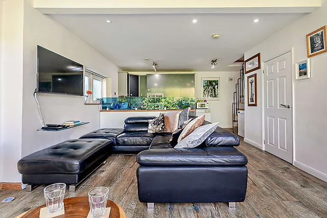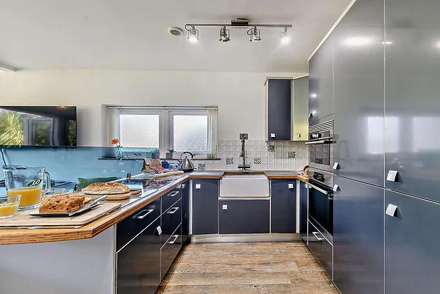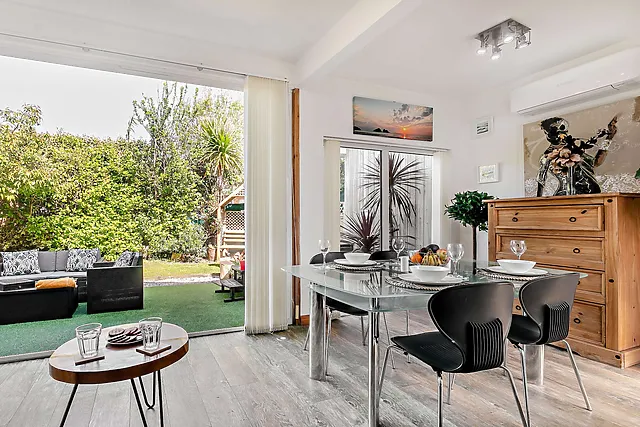 The Studio boasts a stylish lounge/kitchen/dining area with bi-folding doors that open to delightful gardens, allowing you to bask in splendid sunsets. The kitchen is fully equipped for all your culinary needs, ensuring a comfortable and convenient stay.