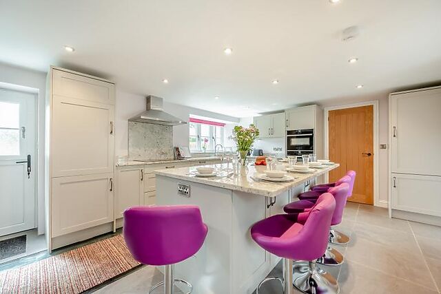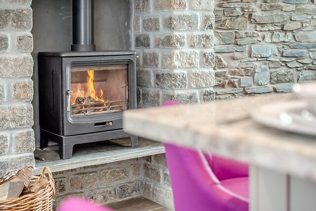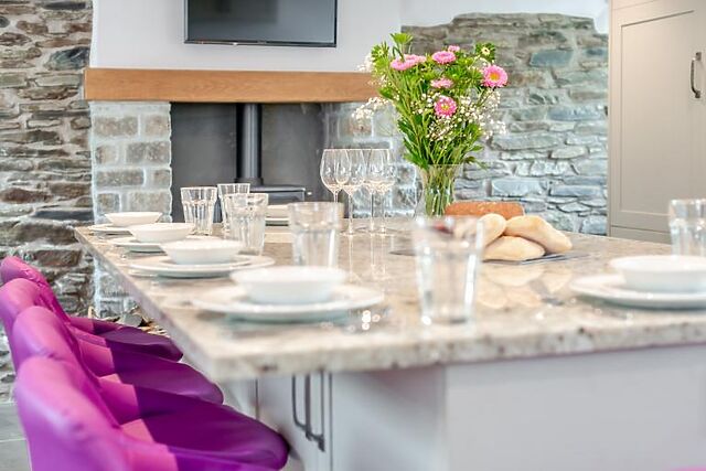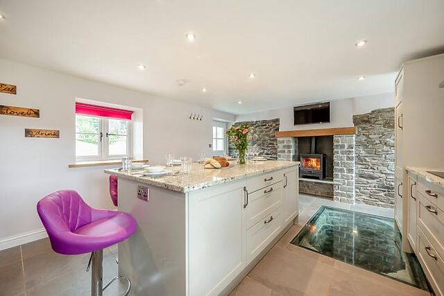 As you step into the kitchen, you'll be captivated by the original well, beautifully lit to create a magical atmosphere. The kitchen is well-equipped and features a cosy wood burner and a sociable kitchen island.