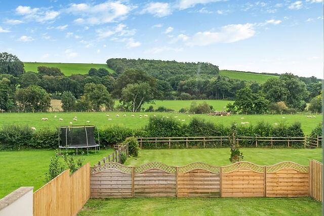 The outdoor area includes a decked space with seating, perfect for al fresco dining, and a hot tub with stunning field views.