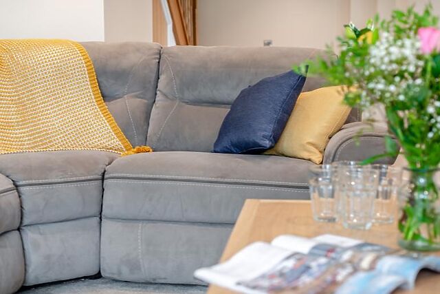 The lounge area is perfect for relaxing, with comfortable sofas and a Smart TV for your entertainment.