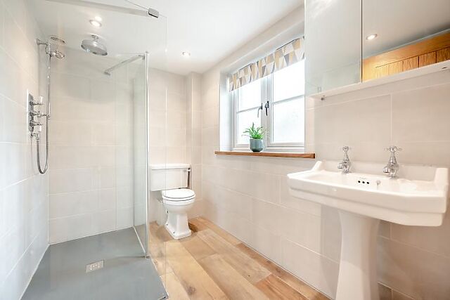 Upstairs, you'll find a king-size bedroom, a double bedroom, and a bunk room suitable for children. The family bathroom boasts a walk-in power shower, ideal for refreshing after a day of exploring.