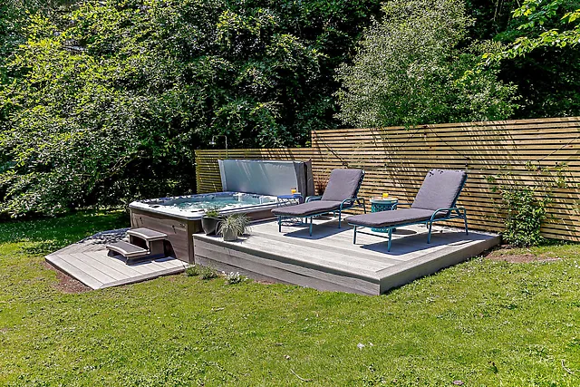 Yes, the accommodation features a seven-seater private hot tub, which is situated on a raised decking area, perfect for relaxation and unwinding after a day of activities.