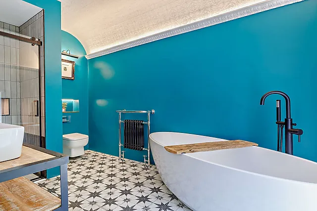 The interior design reflects a stylish blend of traditional charm and modern luxury, ensuring a stay that is both comfortable and memorable.