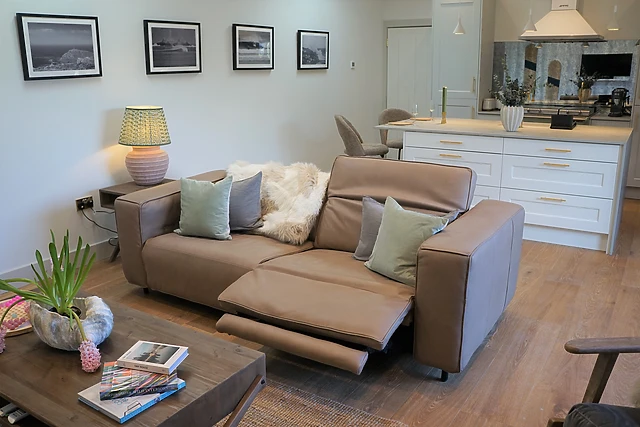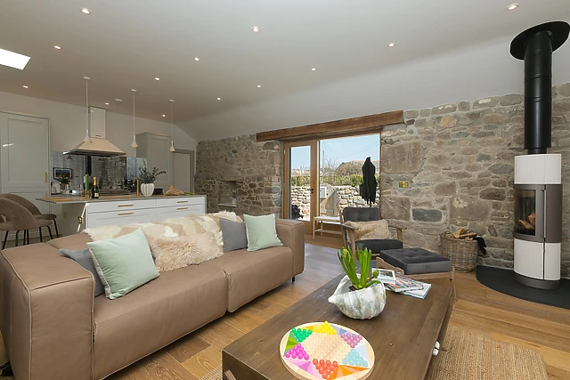 The open-plan living space exudes contemporary elegance, featuring underfloor heating, a woodburning stove, and a leather reclining sofa.