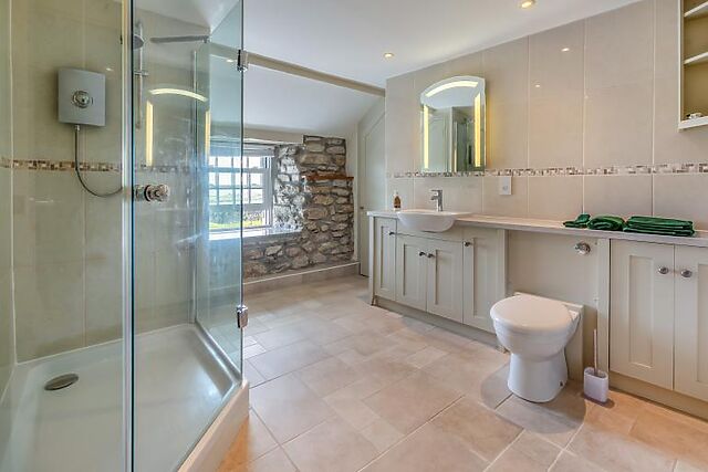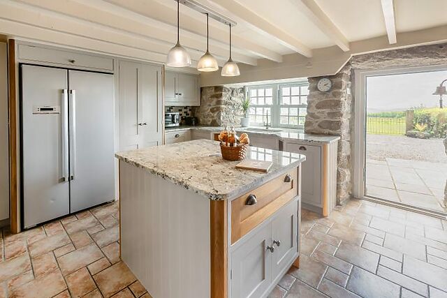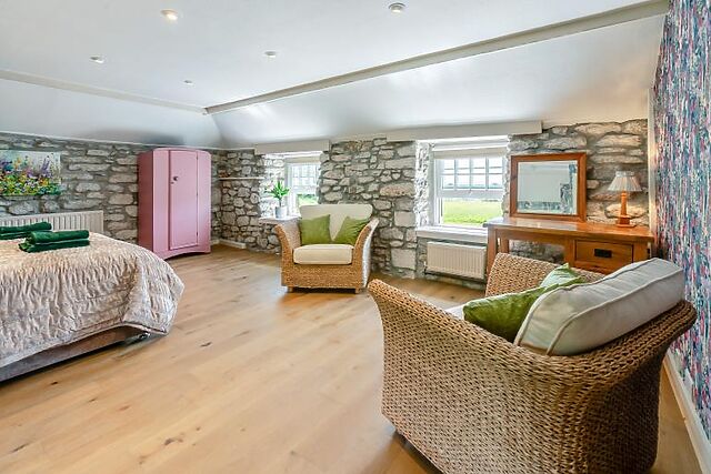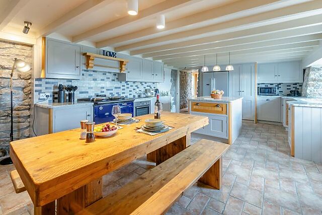 The large kitchen/diner boasts a long dining table with bench seating, an ornamental AGA and an American-style fridge/freezer with masses of space for delicious ingredients. Head upstairs to find the spacious shower room and the super-king-size bedroom, which offers views over the rolling countryside towards the sea.