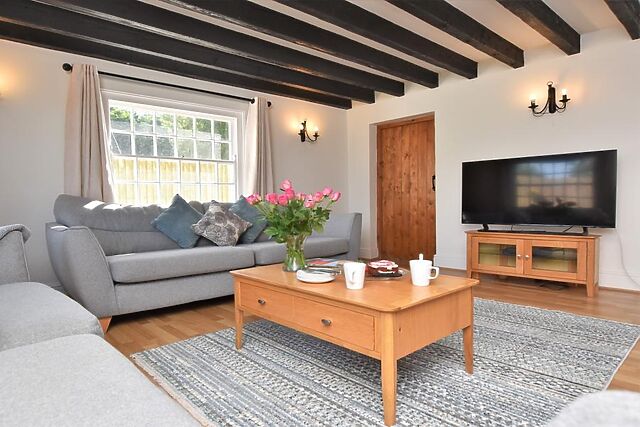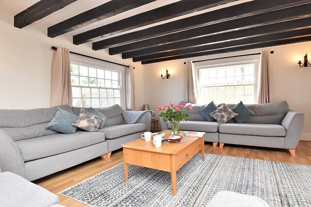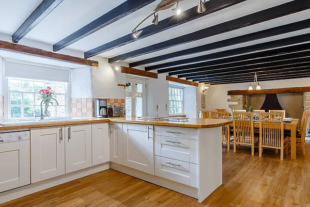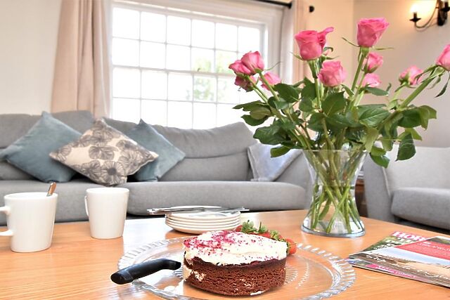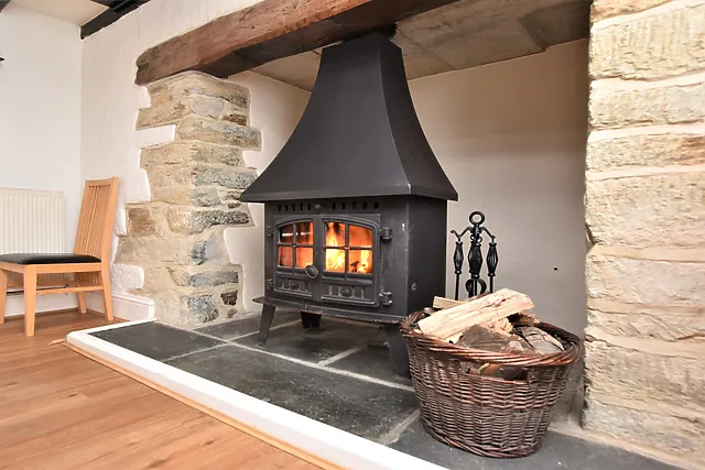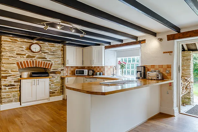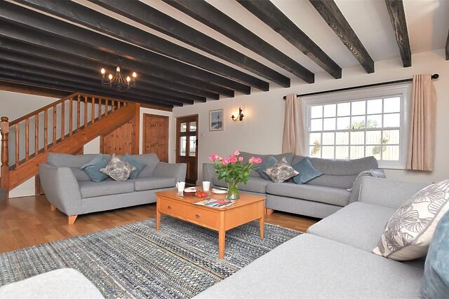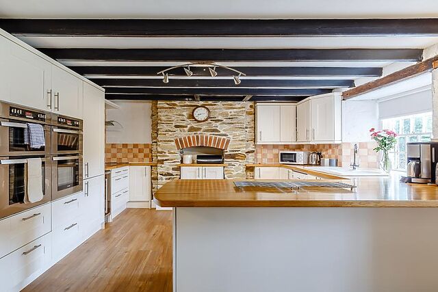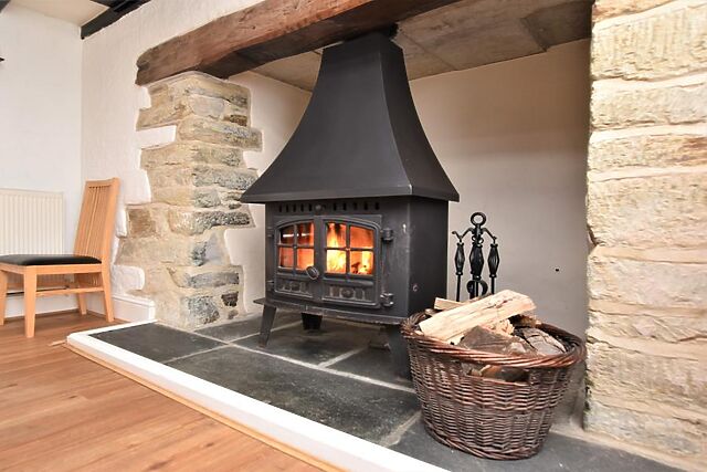 The interiors boast stylish decor, blending modern amenities with traditional features such as exposed beams and a cosy wood burner.