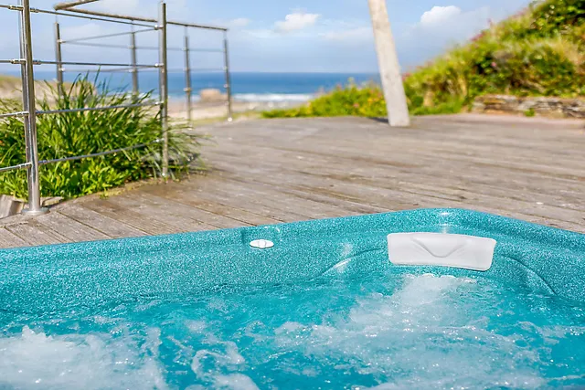 Yes, the accommodation features a luxurious hot tub, perfectly situated for guests to enjoy stunning sunsets across the ocean from the beautifully landscaped decking area.