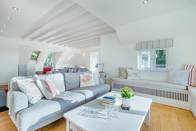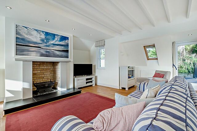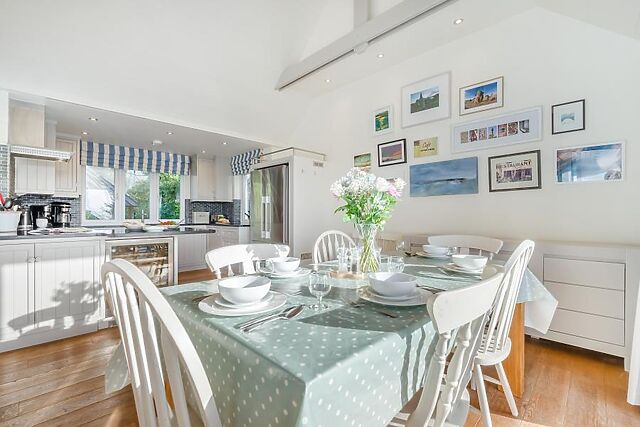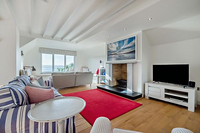A family bathroom and a handy utility room complete this level. Head upstairs to the light-filled open-plan living space, complete with a vaulted ceiling and beams, where comfortable seating invites you to settle in and soak up those sensational views.
